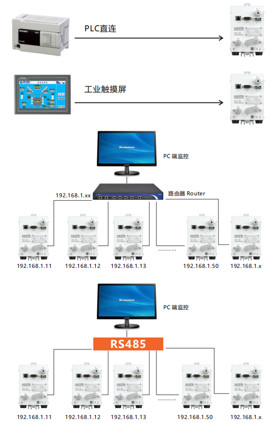 支持TCP/IP協(xié)議及modbus協(xié)議。網(wǎng)線連接,路由器分配,大規(guī)模的擴展非常方便。