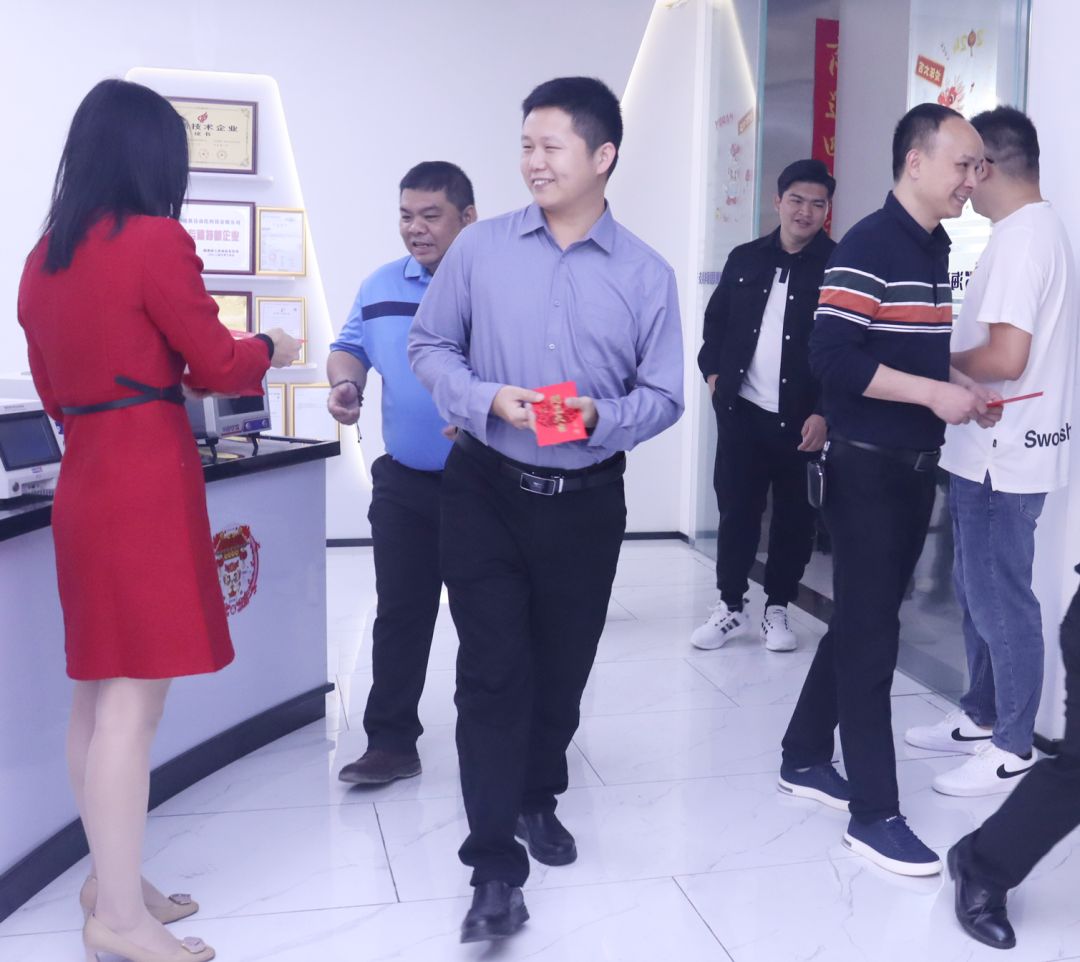 隨后,財(cái)務(wù)部在三樓門前,為返崗的家人們一一送上新年問候及開工紅包,一封「開工利是」,寄托著一份心意,更是對(duì)全體員工的勉勵(lì)。