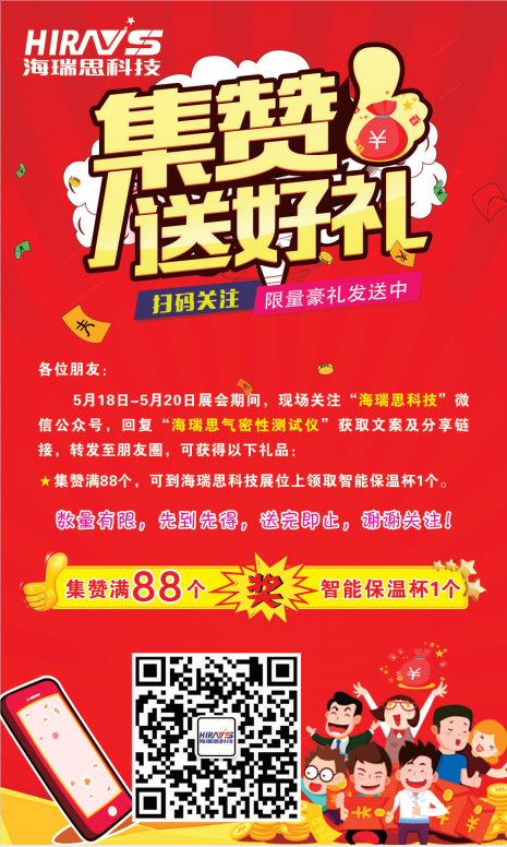 在本次展會(huì)上,海瑞思科技除了給大家?guī)?lái)了先進(jìn)的氣密性防水檢測(cè)設(shè)備外,還準(zhǔn)備了驚喜的集贊送好禮活動(dòng)。在5月18日-5月20日展會(huì)期間,現(xiàn)場(chǎng)關(guān)注“海瑞思科技”微信公眾號(hào),回復(fù)“海瑞思氣密性測(cè)試儀”獲取文案及分享鏈接,轉(zhuǎn)發(fā)至朋友圈,可獲得以下禮品: