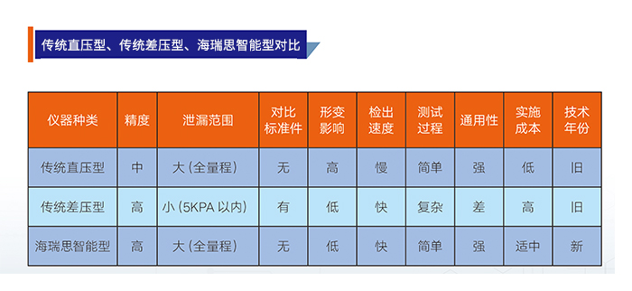 目前傳統(tǒng)氣密性測試儀根據(jù)其傳感器形式分為:直壓式,差壓式,和流量式。傳統(tǒng)直壓式測試儀精度不高,準(zhǔn)確性差;差壓式測試儀精度高,但檢測量程小(通常只有5Kpa),需要有比對標(biāo)準(zhǔn)件,實(shí)施復(fù)雜;針對以上問題海瑞思科技采用最新微芯片技術(shù)同時(shí)結(jié)合海瑞思科技自主研發(fā)的“智能壓差”專利算法。在2012年開發(fā)出代智能型測試儀,使其在精度方面媲美差壓式,穩(wěn)定性和成本方法優(yōu)于差壓的測試儀。