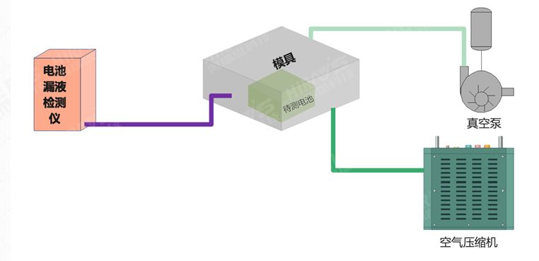 工作原理:將產(chǎn)品放入模具內(nèi),打開真空泵,將模具中的空氣抽走,使腔內(nèi)形成真空狀態(tài);往模具腔內(nèi)充氣,開始檢測電解液中的VOC氣體濃度;依據(jù)設定的值,判定這一批電池是否合格;