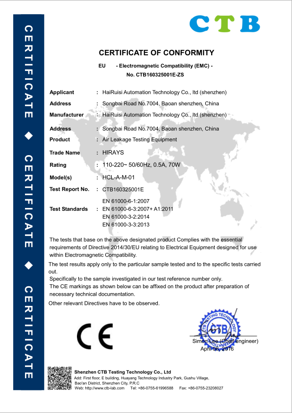 海瑞思氣密性檢測設備,防水檢測儀,密封檢測儀,氣密性測試儀實力表現(xiàn)-獲得ROHS、EMC、CE-LVD證書